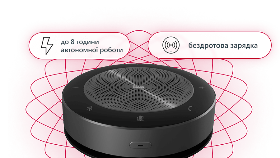 Потужний акумулятор дозволяє Speakerphone працювати в автономному режимі до 8 годин. Функція бездротової зарядки звільнить вашу переговорну кімнату від зайвих дротів та постійного підключення.